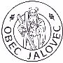 Erb obce Jalovec – zo spodného okraja modrého štítu vyrastajúci strieborný sv. Ondrej so zlatým prstencovým nimbom, pravicou si pridržiava strieborným povrazom previazaný zlatý šikmý kríž, ľavicou na hrudi drží zlatú zatvorenú knihu. |
